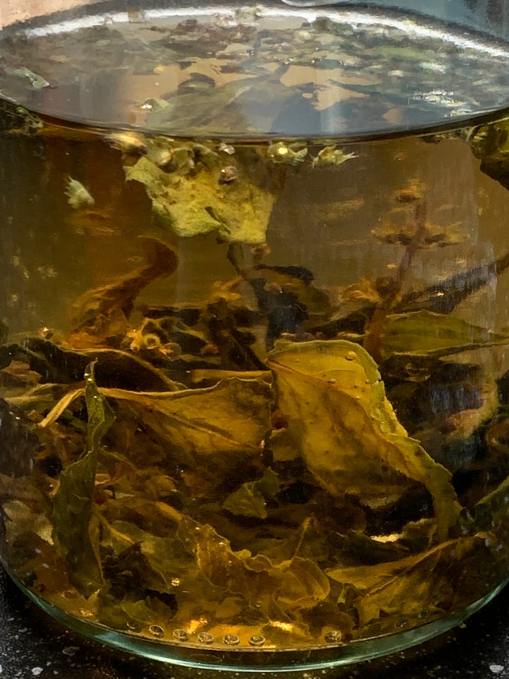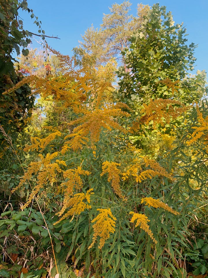 A day later, walking along the limestone path outside of the city, I will look up to see that same half-circle splayed out in the sky with a view of the half moon in the clear sky. I note the reddening landscape, walking, watching as crimson leaves striate swathes of bright red through the still-green leaves, their cells oxygenating and changing, vines winding around deadened branches and telephone poles. I move my feet against the path in a steady rhythm, much like the knife as it cuts against the wooden board the day prior. Grass, still full and green, glistens in the dew-laden morning; goldenrod breathes in wind against the highway. Later, back in the kitchen, tulsi, brewed for tea, shimmers, sifting sunlight through each of the floating leaves, promising its steady grounding, the glass full of that that same yellow-green gold of September’s shifting season.